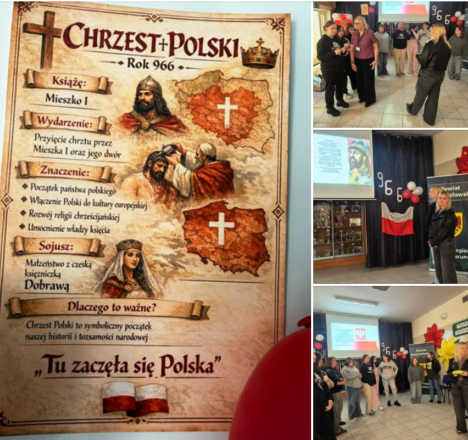 Przyjęcie chrztu przez Polskę w 966 roku jest jednym z najważniejszych wydarzeń w naszych dziejach. 1060 rocznicę tego faktu upamiętniliśmy apelem historycznym, w czasie którego obejrzeliśmy film, prezentację, a wychowanki brały udział w konkursie.